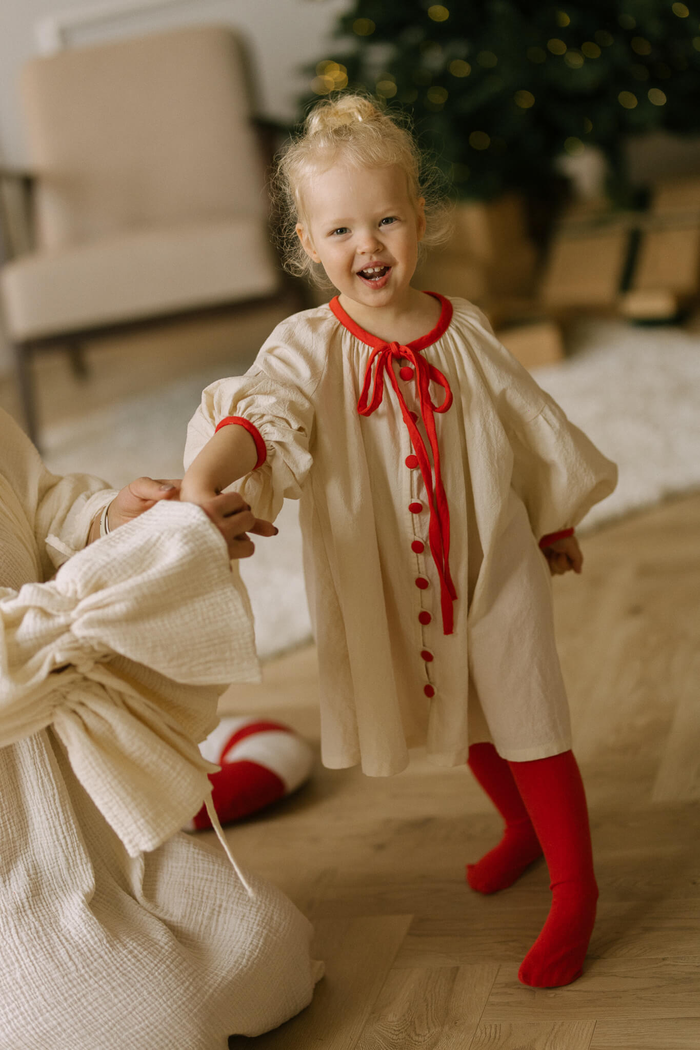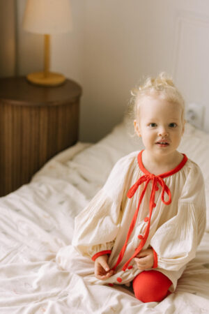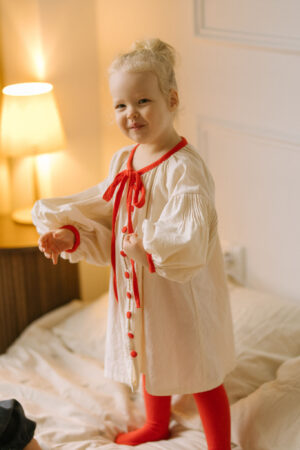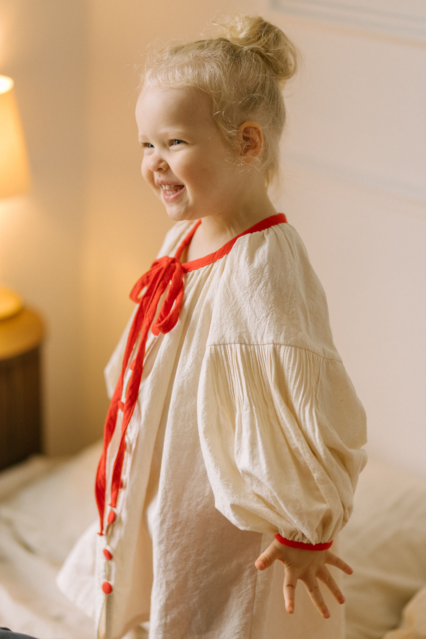 Confecționată din pânză de bumbac în nuanță alb unt, cu mâneci raglan bogate în pliuri fine și accente din muselină roșie, rochia se închide frontal cu nasturi îmbrăcați manual.