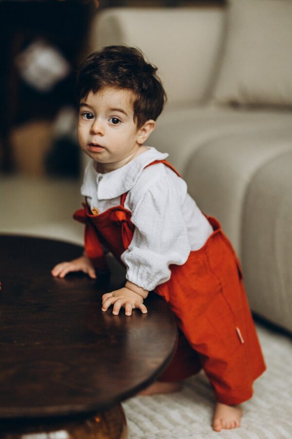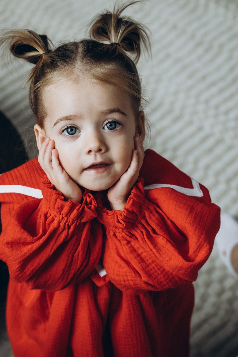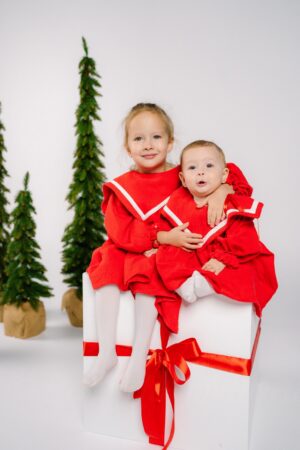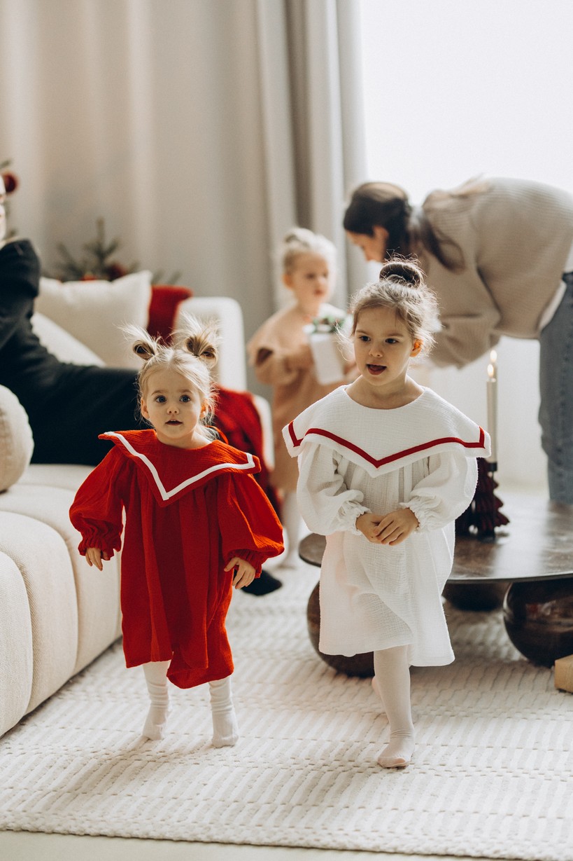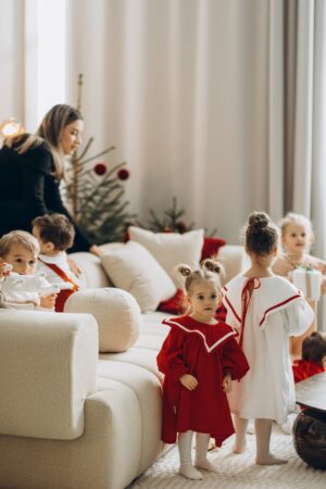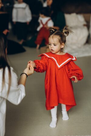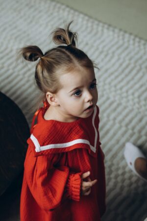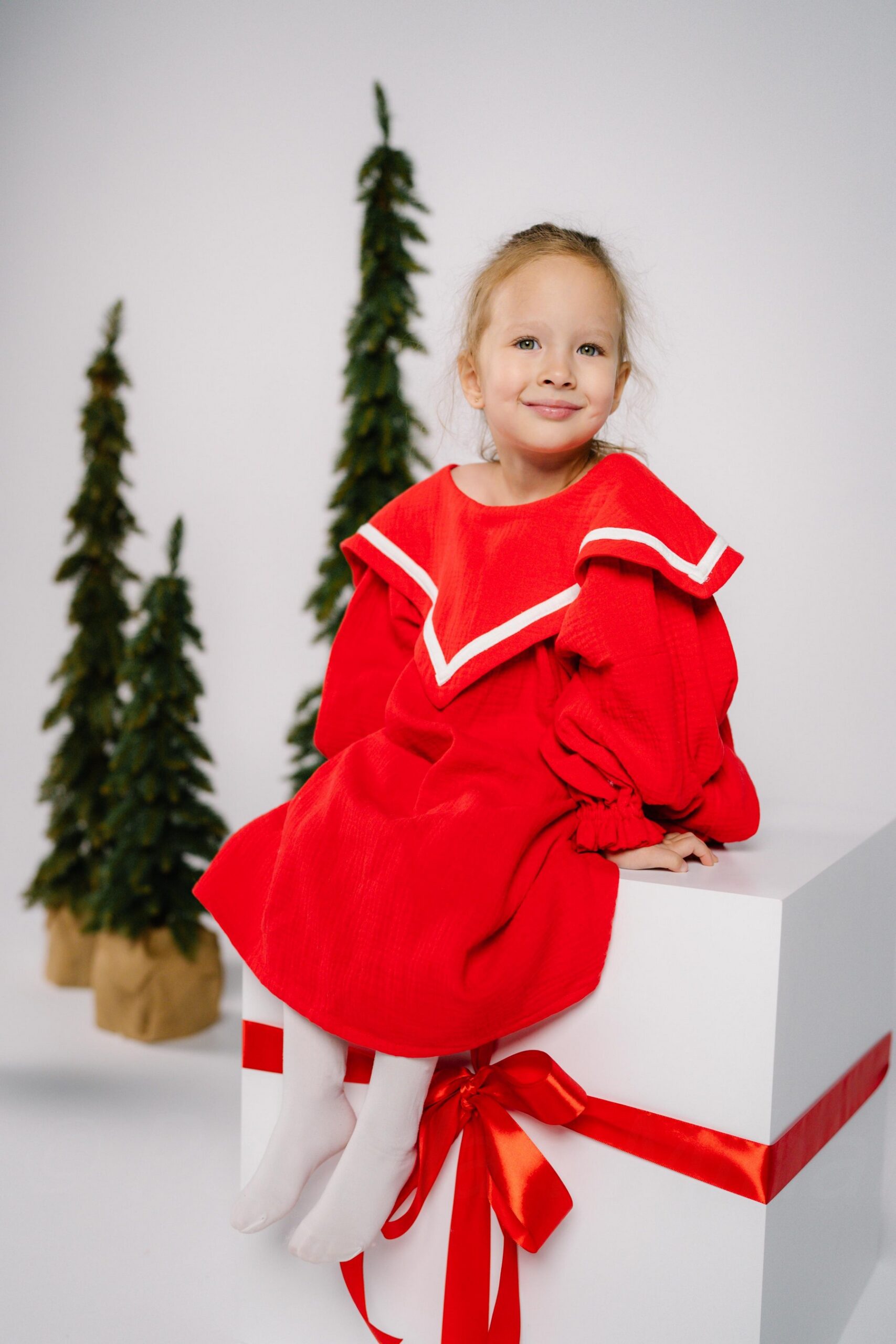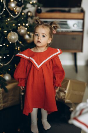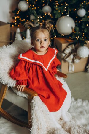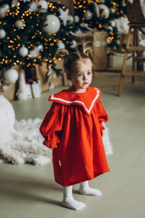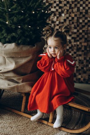 Rochie din muselină organică, ideală pentru sărbători. Dispune de guler în V, mâneci bufante și sistem de închidere cu panglică.