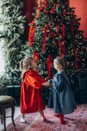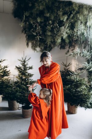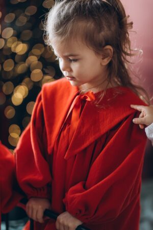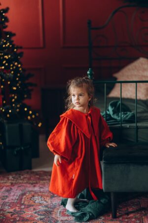 Rochie din bumbac organic, ideală pentru sărbători. Dispune de guler în V, mâneci bufante și sistem de închidere cu panglică.
