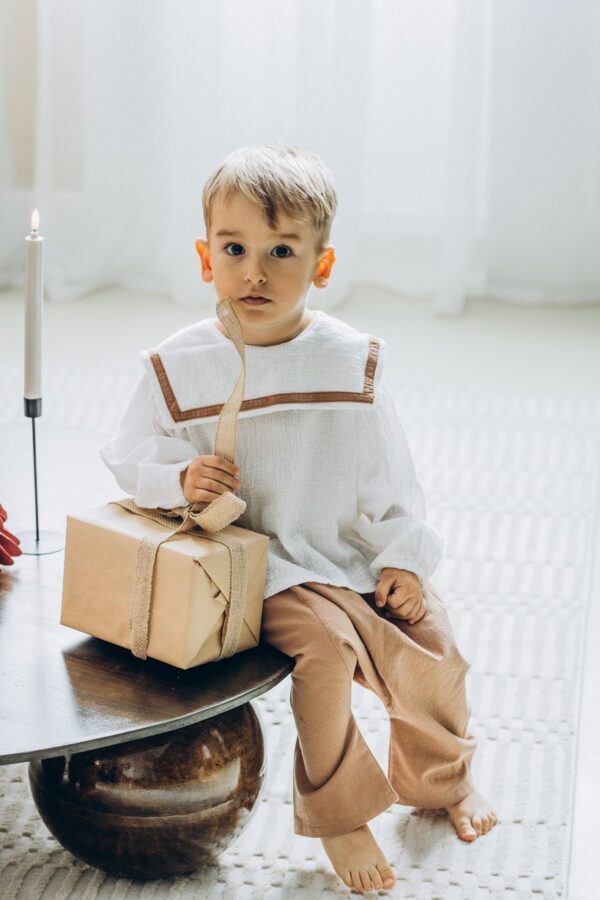 Croiala amplă oferă libertate și confort, iar detaliile feminine — gulerul încrețit și mânecile largi, prinse cu funde elegante — aduc un aer de grație și rafinament.