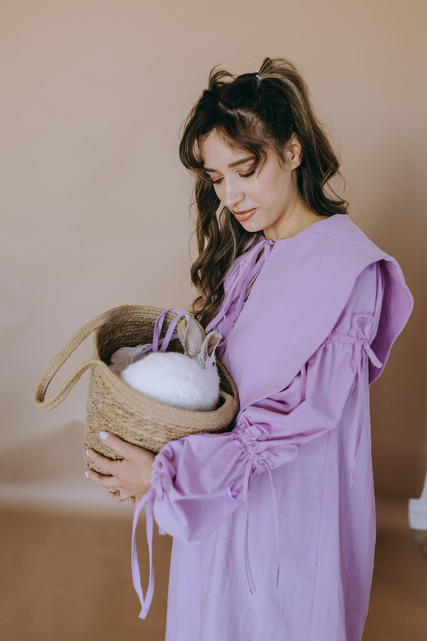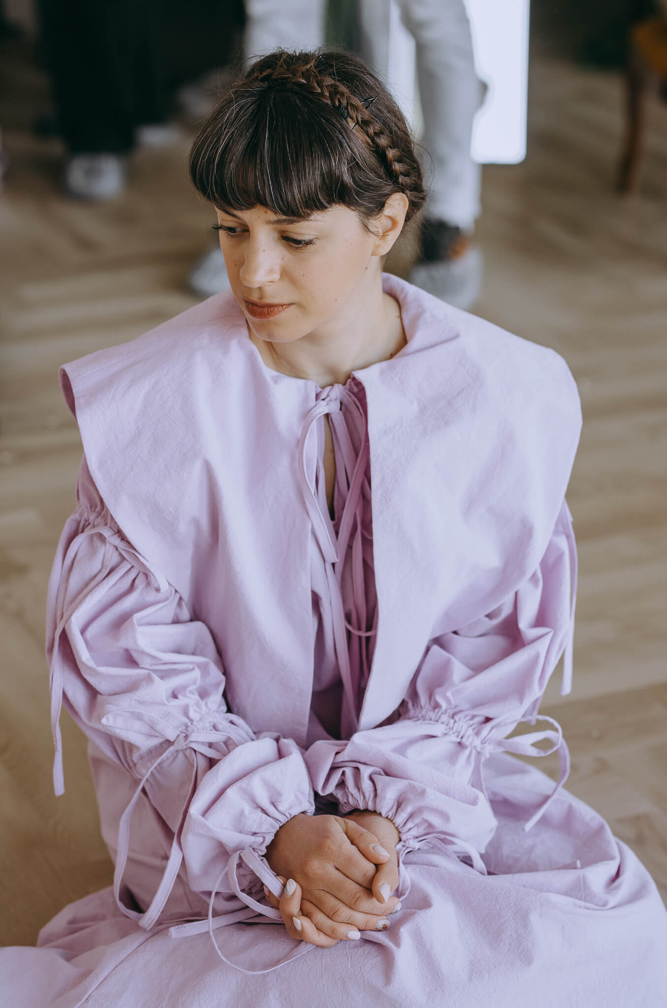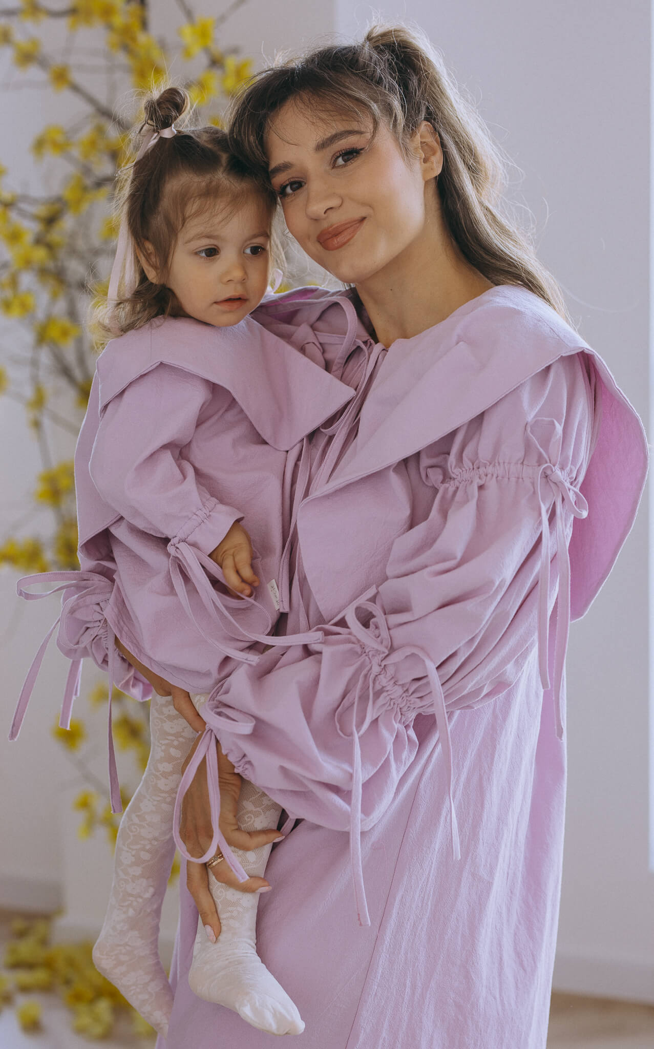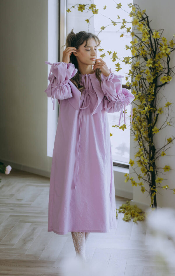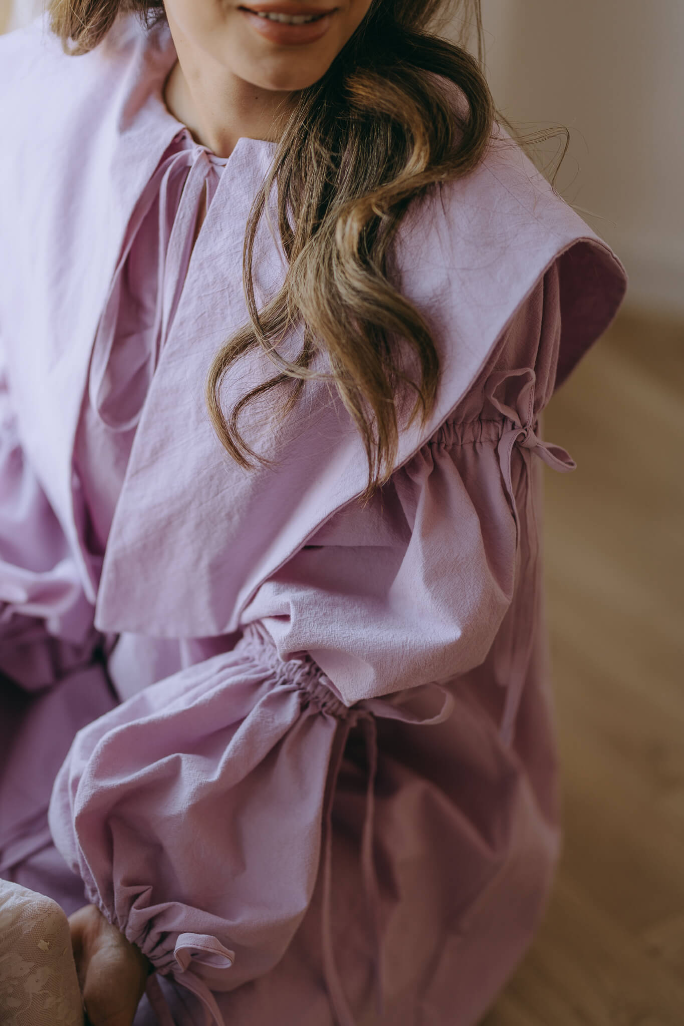 Rochie din pânză topită premium, din bumbac de cea mai buna calitate, cu tușeu catifelat. Rochia dispune de guler delicat, mâneci bufante, cu sistem de inchidere prin șnur.