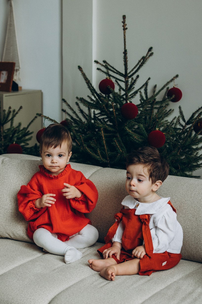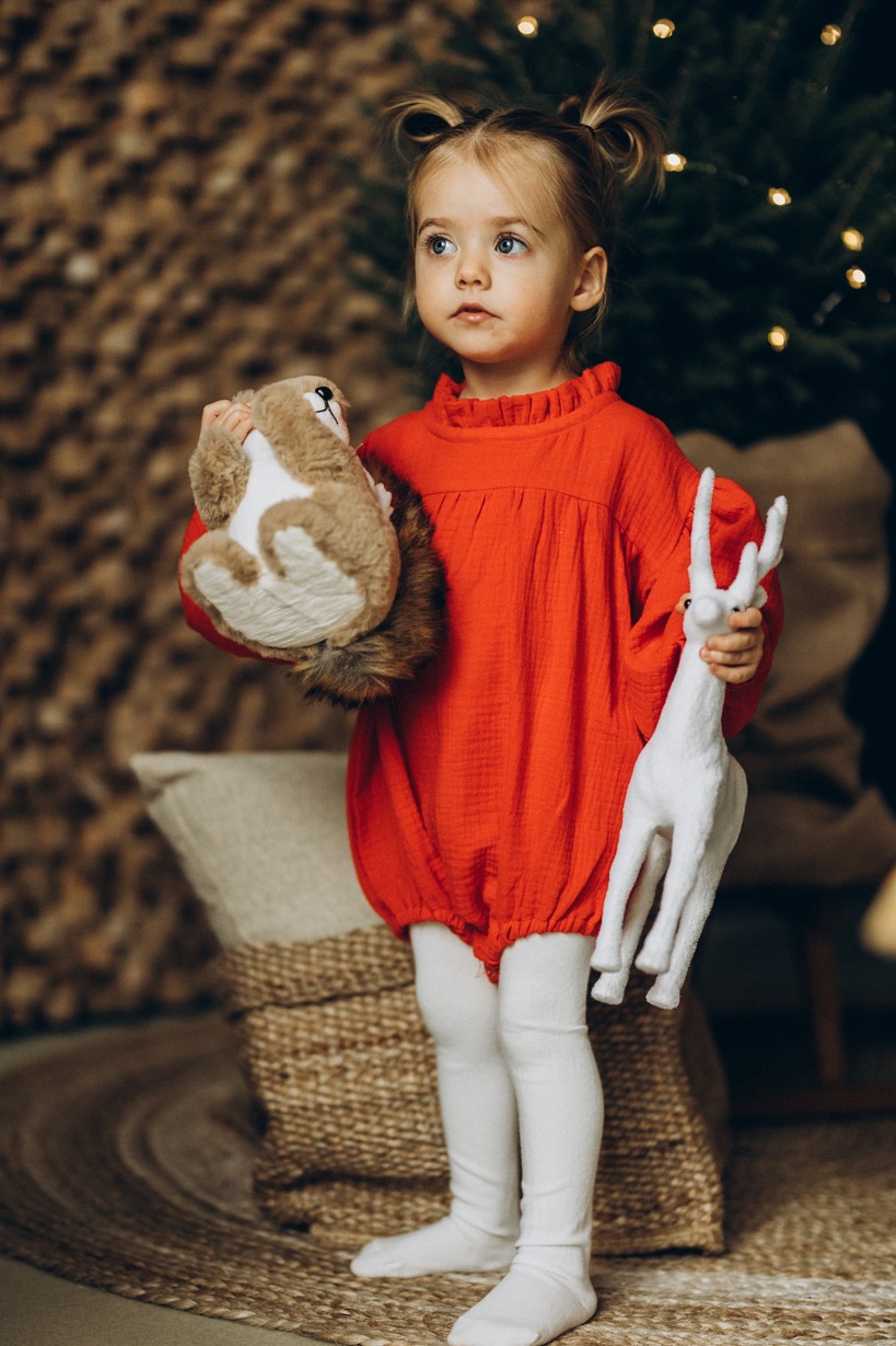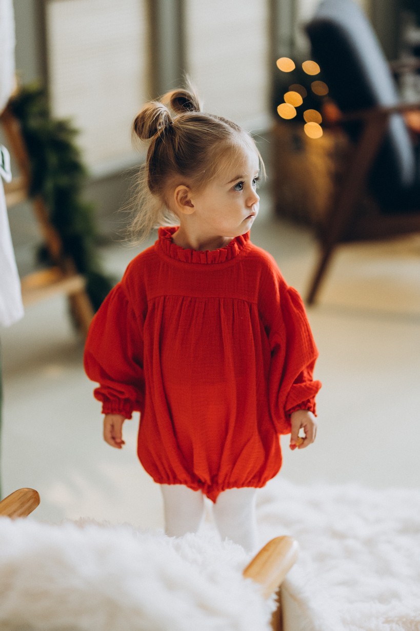 Salopetă scurtă din muselină, cu guler tunică, mâneci bufante și închidere cu panglică.