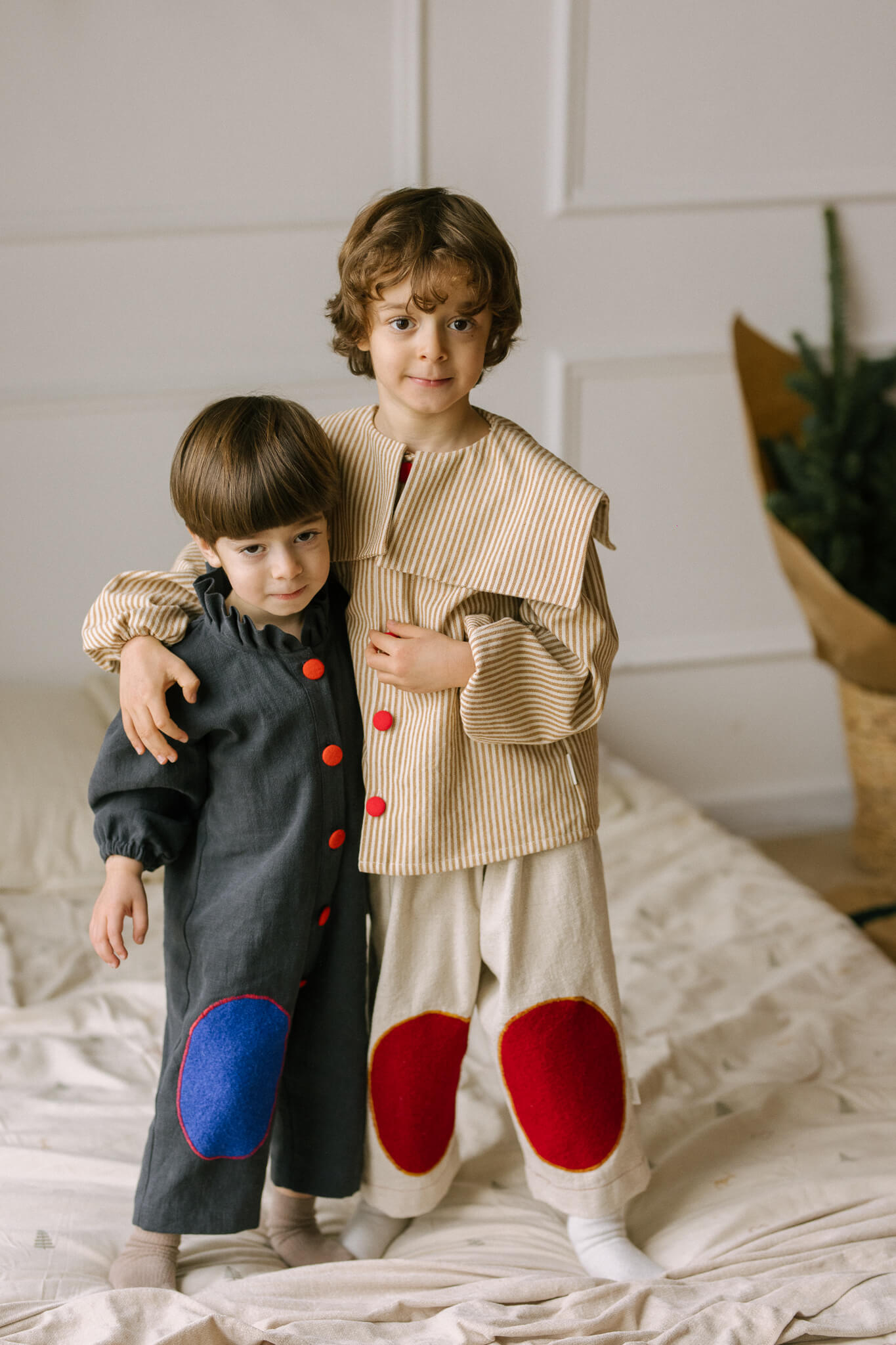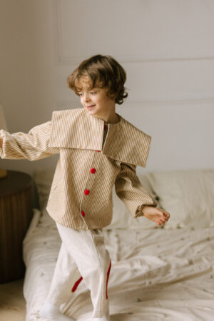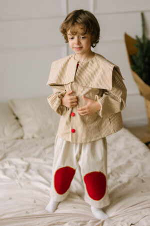 Cămașa din bumbac, în dungi delicate, este completată de nasturi roșii îmbrăcați manual, ce adaugă o notă jucăușă și festivă. Pantalonii comozi, din in prespălat, au petice din lână fiartă roșie — detaliul care oferă un contrast plin de personalitate și farmec.