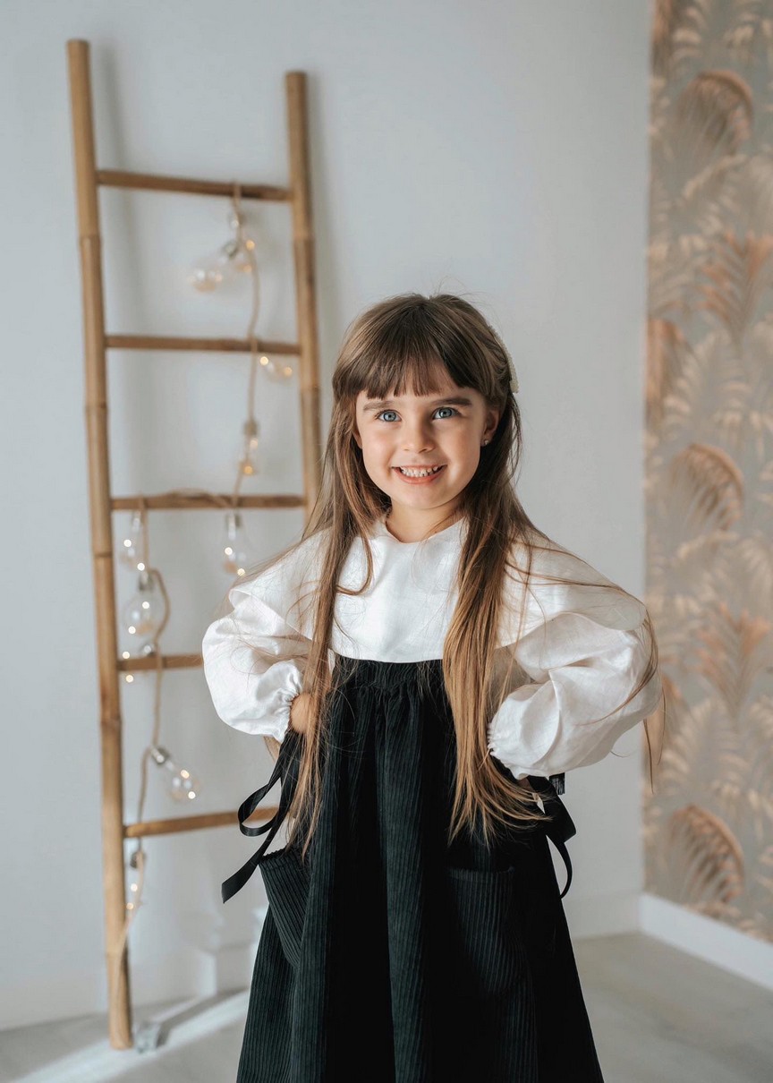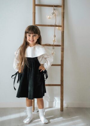 Set din bumbac, compus din cămașă cu guler și mâneci bufante, cu închidere cu panglică, și sarafan cu bretele reglabile.