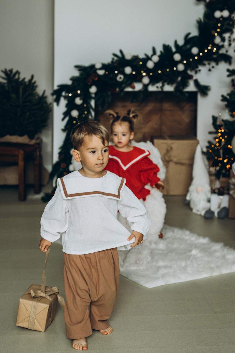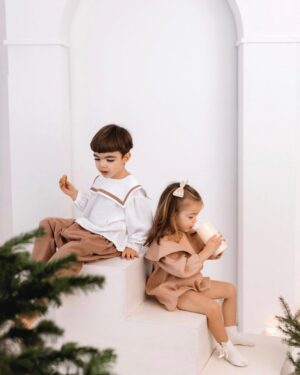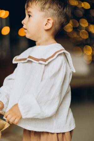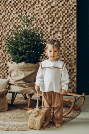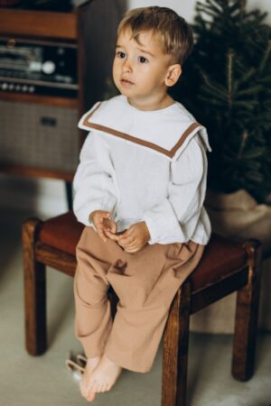 Set din bumbac, perfect pentru zilele de sărbătoare, compus din cămașă cu guler și pantaloni lejeri.