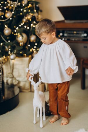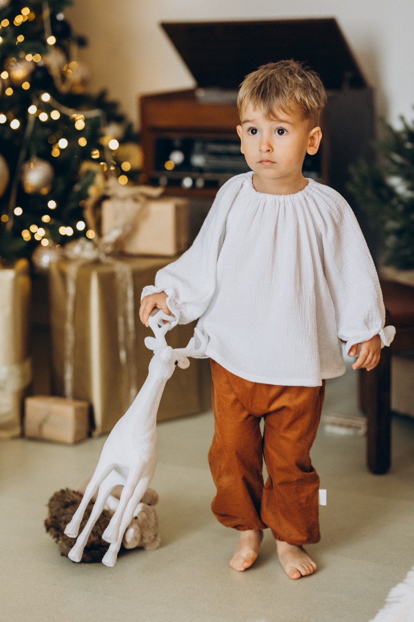 Set din bumbac, ideal pentru zilele de sărbătoare, compus din bluză tip ie și pantaloni.